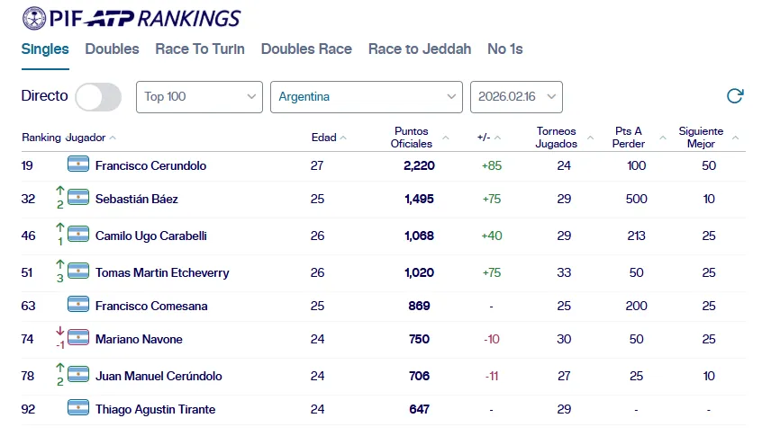 Dentro del Top 10, cuatro argentinos consiguieron escalar posiciones durante esta semana. El mejor ubicado es Sebastián Báez, que alcanzó las semifinales del Argentina Open y ahora se ubica en el 32° lugar, solo detrás de Cerúndolo entre los nacionales.