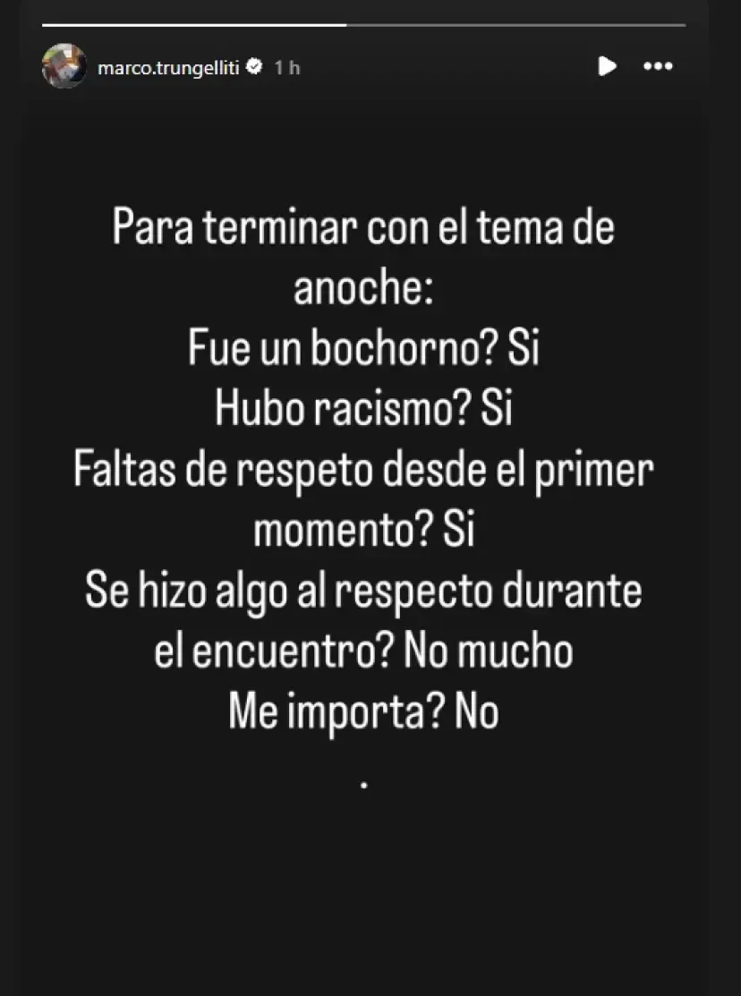 “Para terminar con el tema de anoche. ¿Fue un bochorno? Sí. ¿Hubo racismo? Sí. ¿Faltas de respeto desde el primer momento? Sí. ¿Se hizo algo al respecto durante el encuentro? No. ¿Me importa? No”, escribió el jugador de 36 años en una historia de Instagram.