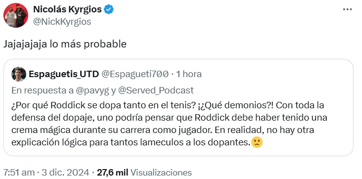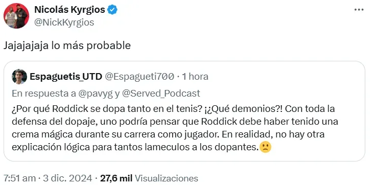 El usuario de X @Spaghetti700 publicó en su red social: “¿Por qué Roddick avala el dopaje en el tenis? ¿Qué demonios? Con toda la defensa del dopaje, uno podría pensar que Roddick debe haber tenido una crema mágica durante su carrera como jugador. En realidad, no hay otra explicación lógica para tantos lamecu.. a los dopantes”. A dicho tuit, Kyrgios respondió desde su cuenta: “Jajaj es lo más probable”.