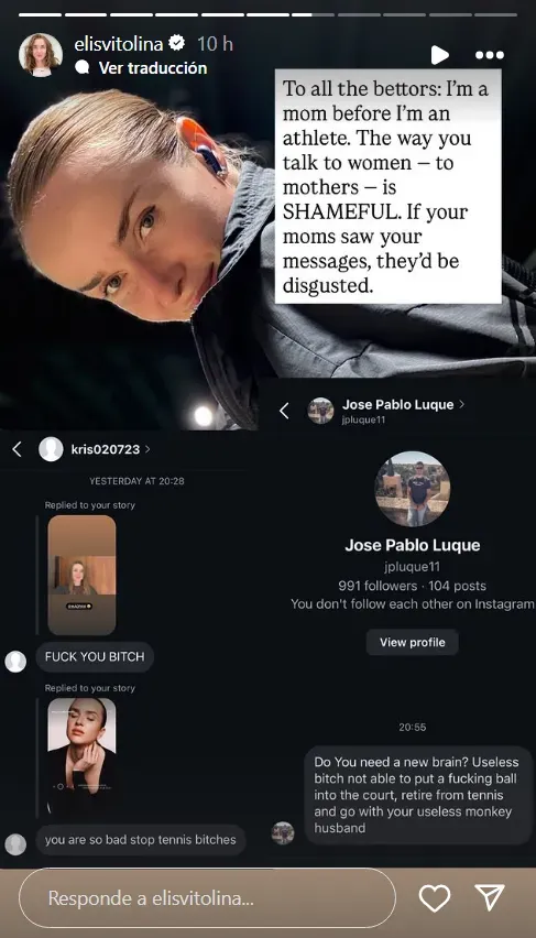 “A todos los apostadores: Soy madre antes que deportista. La forma en que les hablan a las mujeres, a las madres, es VERGONZOSA. Si sus madres vieran sus mensajes, les daría asco…”, escribió Svitolina y lo puso en todos los mensajes donde se veían las capturas. Cabe recordar que la ucraniana está casada hace unos años con Gael Monfils, tenista francés y que con él tienen una hija.