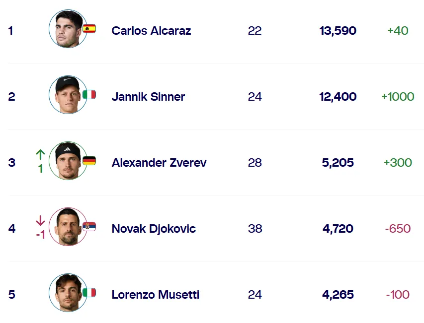 • El tenista Jannik Sinner debe sumar 190 puntos más que Carlos Alcaraz para ser líder.