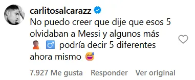 En la misma publicación que hizo Overtennis con el video en que Carlitos elegía a esos cinco futbolistas, el propio tenista hizo un comentario y lamentó haberse olvidado de Lionel Messi: “No puedo creer que dije esos cinco, olvidándome de Messi y algunos más. Podría decir cinco diferentes ahora mismo”, acompañado del emoji de una sonrisa.