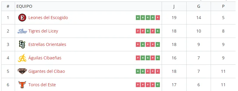 La tabla de posiciones de la Liga Profesional de Béisbol de República Dominicana