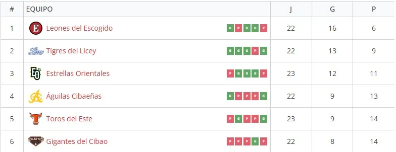 La tabla de posiciones de la Liga Profesional de Béisbol de República Dominicana