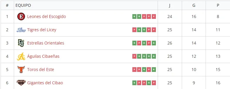 La tabla de posiciones de la Liga Profesional de Béisbol de República Dominicana