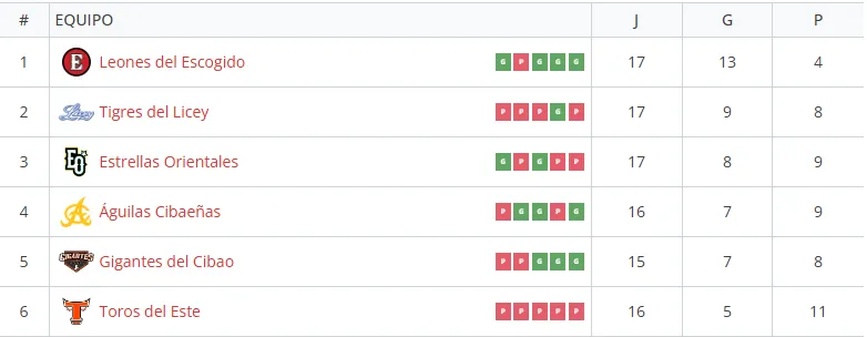 La tabla de posiciones de la Liga Profesional de Béisbol de República Dominicana