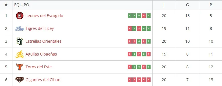 La tabla de posiciones de la Liga Profesional de Béisbol de República Dominicana