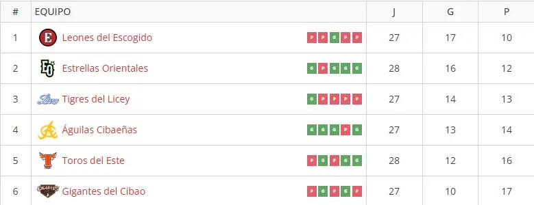 La tabla de posiciones de la Liga Profesional de Béisbol de República Dominicana