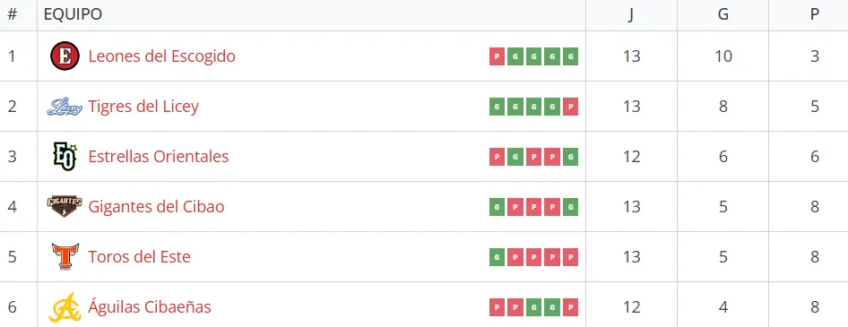 La tabla de posiciones de la Liga Profesional de Béisbol de República Dominicana
