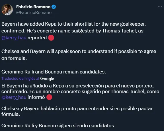 Ante esto, Thomas Tuchel quiere un nuevo arquero y han surgido algunos nombres como el de Gerónimo Rulli y Yassine Bounou. Sin embargo, tal como adelantó el periodista Kerry Hau de Sport1 y confirmó Fabrizio Romano, apareció Kepa Arrizabalaga.