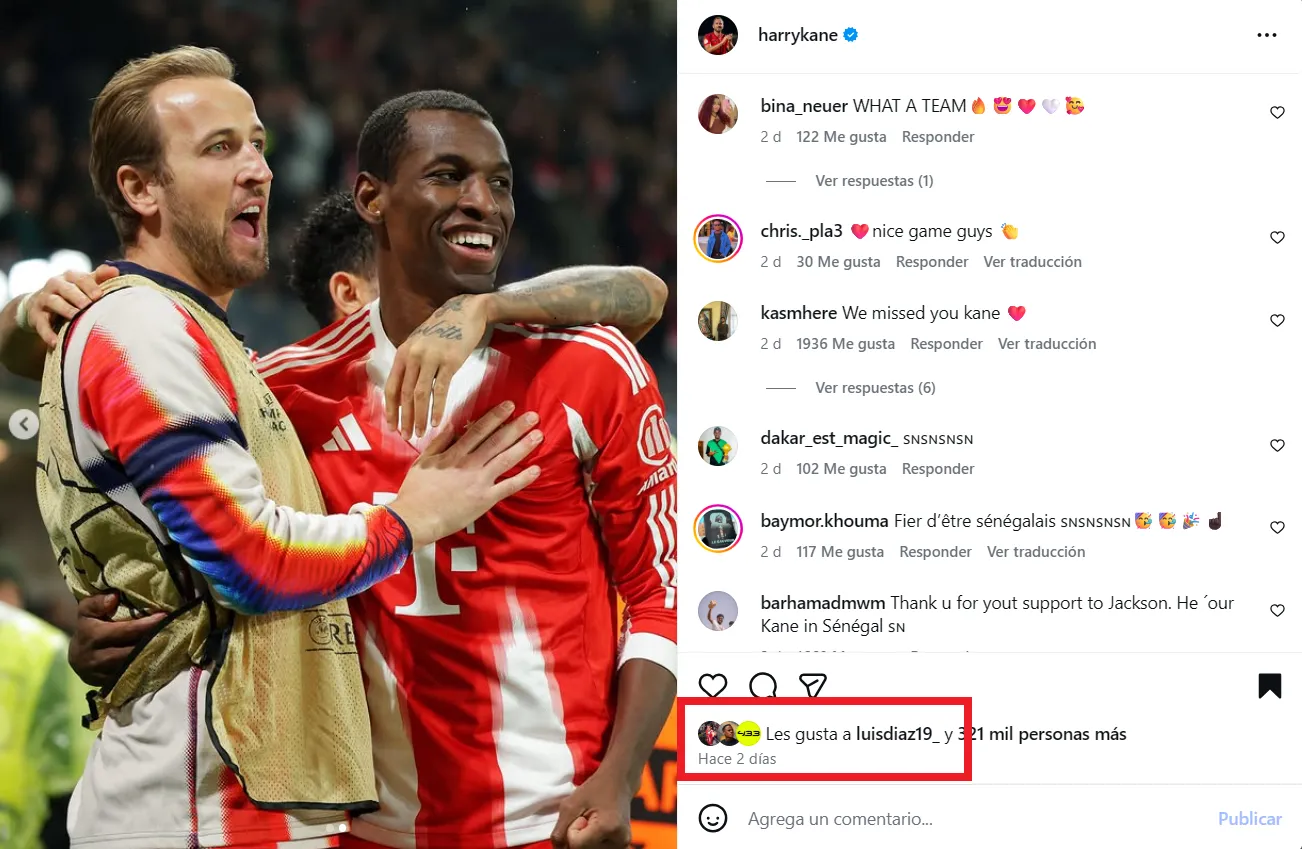 “¡Una actuación irreal para continuar nuestra racha de victorias! Los chicos estuvieron excelentes desde el primer minuto. ¡A por el partido de vuelta!”, publicó Harry Kane en Instagram con dos fotos en las que Luis Díaz apareció escondido por detrás de Nicolas Jackson. ‘Lucho’ se dio cuenta de esto, y lejos de enojarse, decidió reaccionar con un ‘Me Gusta’.