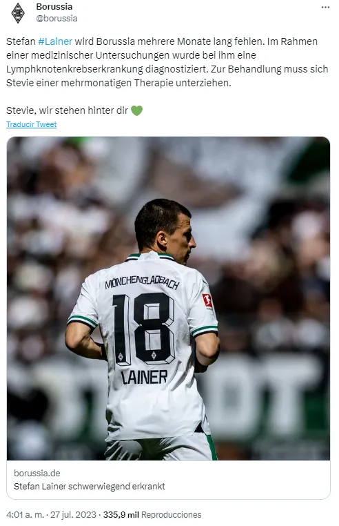 “Stefan Lainer estará varios meses ausente del Borussia. Durante un examen médico, se le diagnosticó cáncer de ganglio linfático. Para el tratamiento, Stevie tiene que someterse a una terapia que dura varios meses” dice el comunicado del club de la Bundesliga.