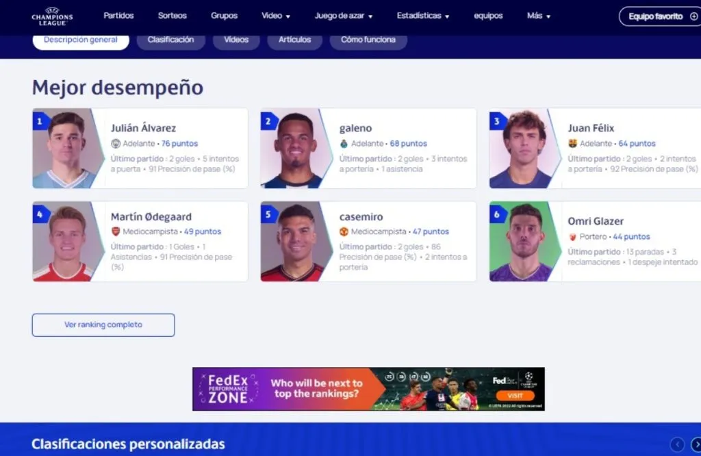 “Las actuaciones de los jugadores están siendo rastreadas a lo largo de la Liga de Campeones de la UEFA, con datos introducidos en un algoritmo especial para crear clasificaciones basadas en actuaciones”, el comunicado del máximo ente del fútbol europeo antes de desvelar que el primero de la primera jornada de la fase de grupos queda en manos del ex River Plate.