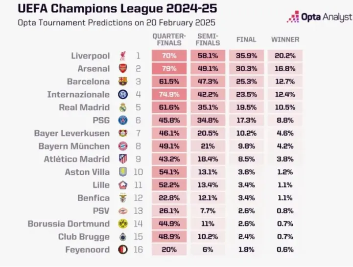Por su parte, el Barcelona reúne el 12,7, el Inter de Milan el 12,4 y el Real Madrid, a pesar de acceder a los Octavos de Final desde los Play Off a causa de su camino irregular en la Fase de Liga, aparece en el quinto escalón de esta predicción con 10,5 % de probabilidades de estar en la Final de la UEFA Champions League, casi 7 puntos más que el Atlético de Madrid (3,8).