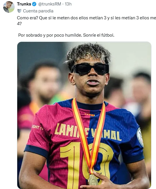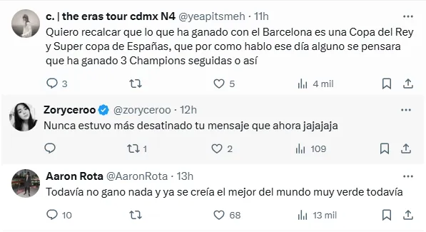 ”Quiero recalcar que lo que ha ganado con el Barcelona es una Copa del Rey y una Supercopa de España, que por como habló ese día alguno se pensara que ha ganado 3 Champions seguidas o así”, escribió el usuario de X @yeapitsmeh. Por su parte, otro de los comentarios, en este caso de @Carlitosnog9, cita la analogía que desde los medios catalanes se hace con Leo Messi: ”Y pensar que quieren compararlo con Messi”.