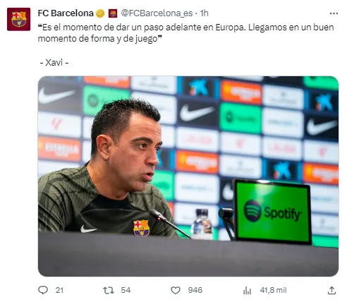 “Hay una exigencia y el listón está muy elevado. Es la consecuencia del Barça de los últimos años, de nuestra etapa como futbolista donde se ganaron 4 Champions de 2006 a 2015. Nos gustan los retos pero la exigencia del Barça es bestial, es la consecuencia de heredar una etapa brillante, la mejor de la historia de este club” fueron las palabras de Xavi en la previa del encuentro.