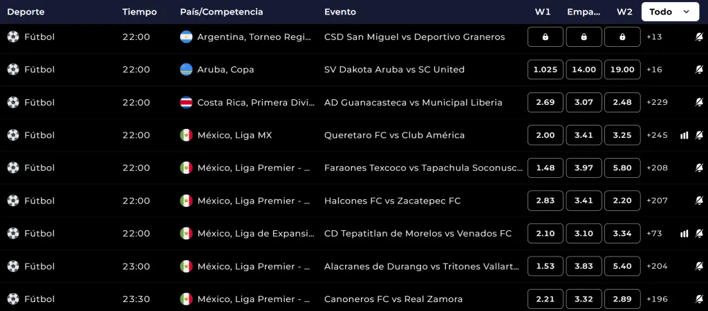 Deportes y mercados de apuestas disponibles