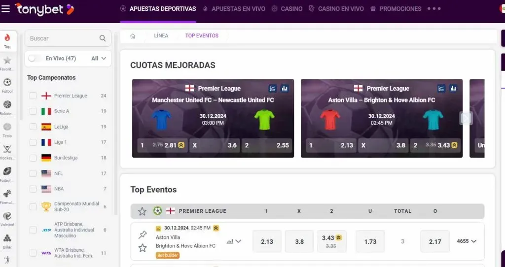 Uno de los elementos más valorados en las Tonybet opiniones es el hecho de que este operador cuenta con una extensa variedad de alternativas para realizar apuestas deportivas, lo cual se evidencia al explorar más detalladamente su sección de apuestas deportivas. La oferta de disciplinas deportivas disponibles para apostar es muy amplia, considerando tanto las disciplinas deportivas tradicionales como las de E-Sports, totalizando casi 40 alternativas de apuestas diferentes para los usuarios.