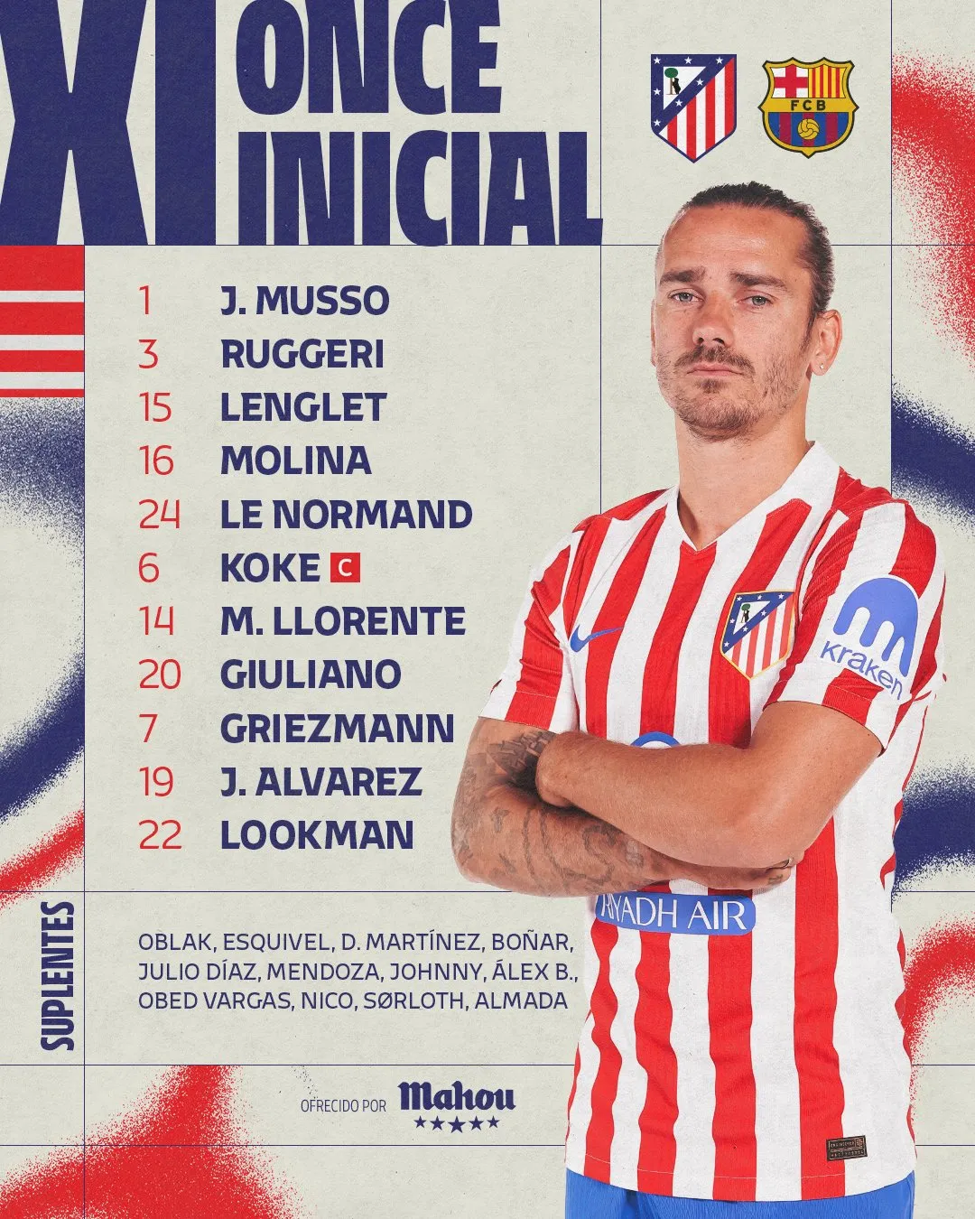 El once del Atlético de Madrid vs. Barcelona: Musso; Molina, LeNormand, Lenglet, Ruggeri; Simeone, Marcos Llorente, Koke, Lookman; Griezmann y Julián Álvarez.