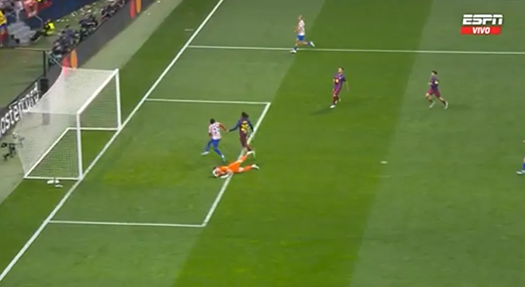 La estrella del Barcelona hace lo que quiere en el área. Tras gambetear y acumular marcadores, cedió un preciso balón para Dani Olmo quien sacó el tiro muy elevado.