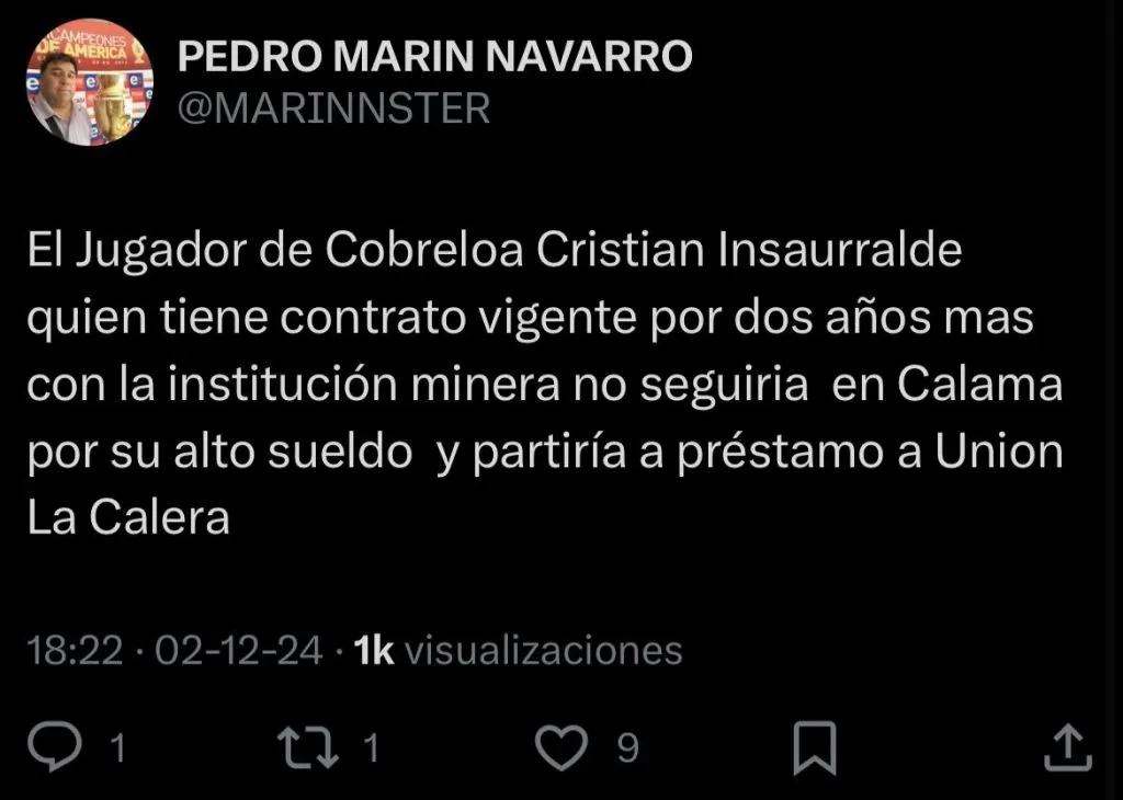 Según informó el periodista Pedro Marín en su cuenta de ‘X’, Insaurralde no seguiría en Cobreloa y su nuevo club en el fútbol chileno sería Unión La Calera, equipo al que llegaría en condición de préstamo.