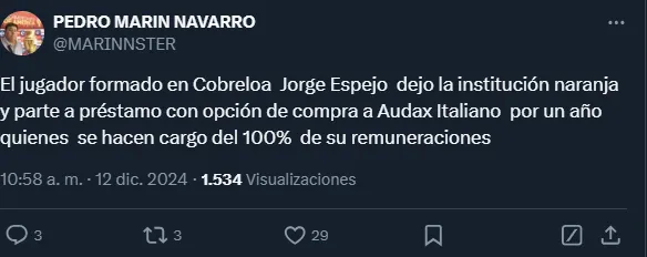 Según informó el periodista, Pedro Marín en su cuenta de ‘X’, el defensor Jorge Espejo tendría todo listo para dejar Cobreloa y ser nuevo refuerzo de Audax Italiano para el 2025.