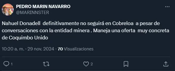 “Nahuel Donadell definitivamente no seguirá en Cobreloa a pesar de conversaciones con la entidad minera. Maneja una oferta muy concreta de Coquimbo Unido”, informó el comunicador.