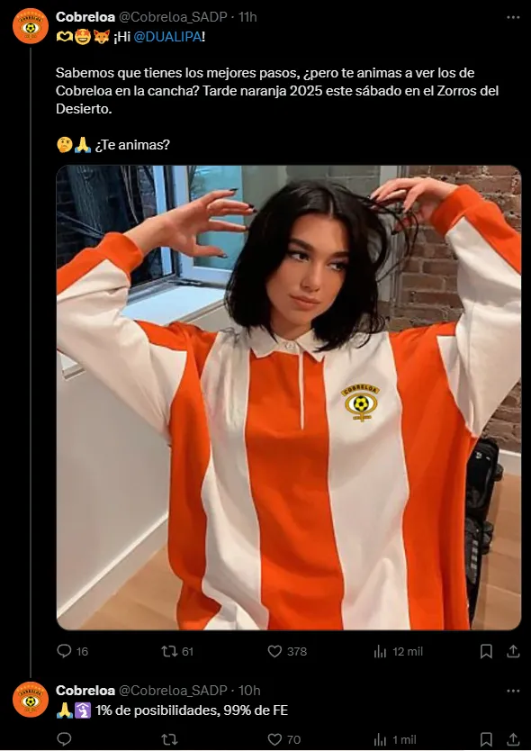 Segundos después, el cuadro loíno publicó “1% de posibilidades, 99% de FE”, haciéndole saber a los hinchas que es casi imposible que Dua Lipa aparezca por los Zorros del Desierto.