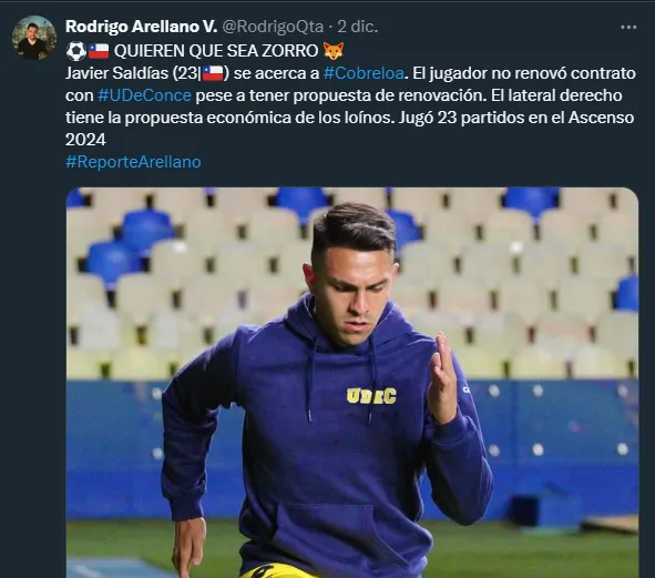 “Javier Saldías se acerca a Cobreloa. El jugador no renovó contrato con Universidad de Concepción pese a tener propuesta de renovación. El lateral derecho tiene la propuesta económica de los loínos. Jugó 23 partidos en el Ascenso 2024”, informó el comunicador.