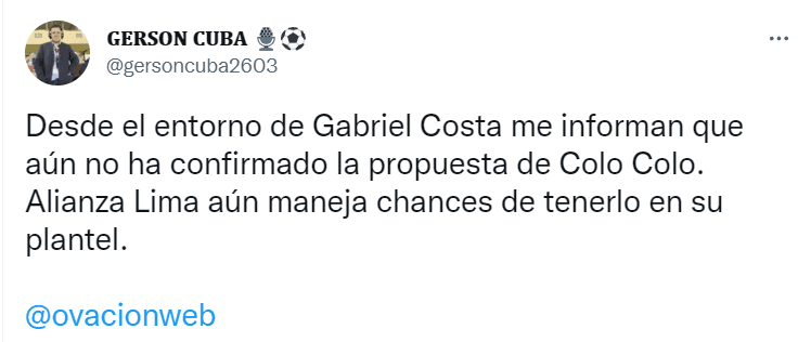 “Desde el entorno de Gabriel Costa me informan que aún no ha confirmado la propuesta de Colo Colo. Alianza Lima aún maneja chances de tenerlo en su plantel”, indicó el reportero del portal deportivo Ovación Web.