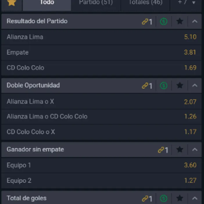 Para Juégalo, el gran favorito para ganar en este duelo de Copa Libertadores es Colo Colo, que paga 1,64 por sobre los 4,85 que paga Alianza Lima, si piensas que los Íntimos se quedan con este compromiso. Ahora, el empate entre ambos en el Estadio Nacional de la capital peruana paga 3,68 veces lo que apuestes.