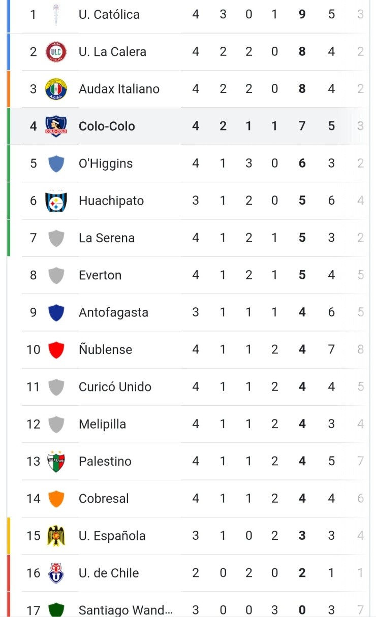 Con los 3 puntos obtenidos en el Sausalito, Colo Colo se posiciona cuarto en la tabla de posiciones con 7 puntos, siendo superado por Unión La Calera y Audax Italiano, ambos con 8 puntos y que empataron en el día de ayer entre sí.