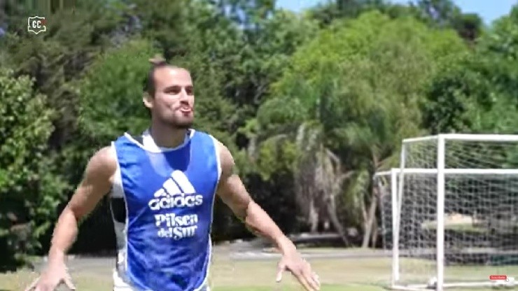 Santos celebrando su golazo en las prácticas como Gareth Bale. | Foto: Colo Colo