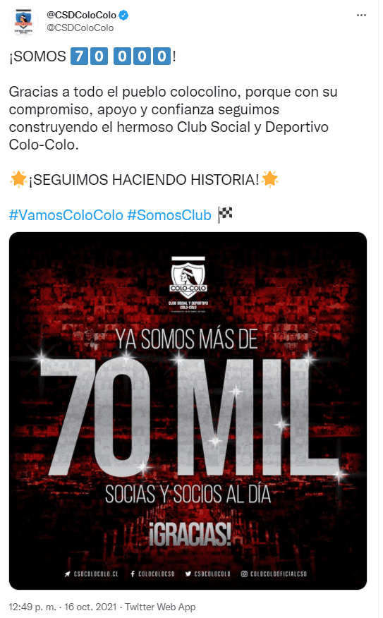 “Gracias a todo el pueblo colocolino, porque con su compromiso, apoyo y confianza seguimos construyendo el hermoso Club Social y Deportivo Colo-Colo. ¡SEGUIMOS HACIENDO HISTORIA!”, fue el mensaje que compartieron a través de su cuenta de Twitter.