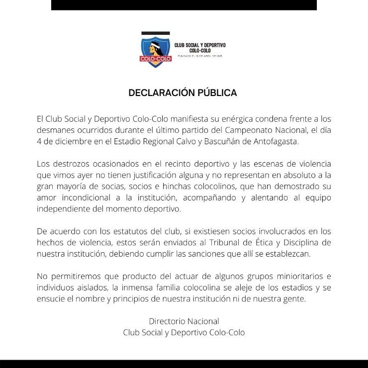 “Los destrozos ocasionados en el recinto deportivo y las escenas de violencia que vimos ayer no tienen justificación alguna y no representan en absoluto a la gran mayoría de socias, socios e hinchas colocolinos, que han demostrado su amor incondicional a la institución, acompañando y alentando al equipo independiente del momento deportivo”.