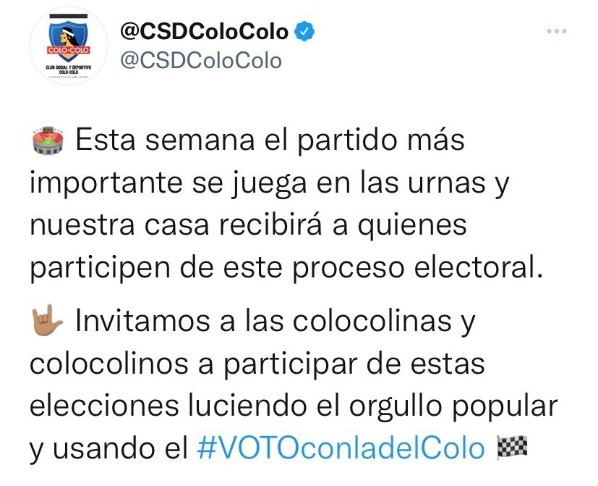 “Invitamos a las colocolinas y colocolinos a participar de estas elecciones luciendo el orgullo populary usando el #VOTOconladelColo”, informaron.