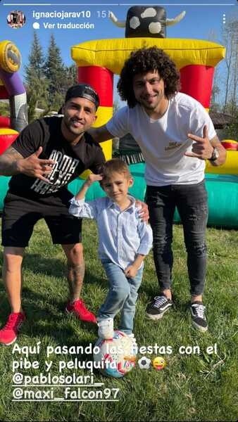 “Aquí pasando las fiestas con el pibe y peluquita” colgó Jara en una foto donde sale él, Maximiliano Falcón y un niño emulando la celebración de Pablo Solari en su gol ante Universidad de Concepción en Talca en el partido por la promoción.