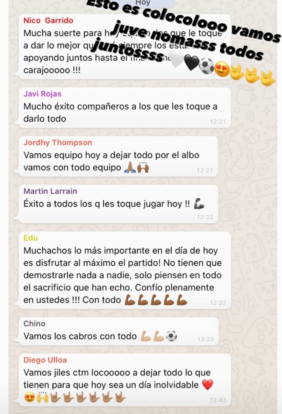 Varios de ellos comparten un grupo de Whatsapp, donde están la gran cantidad jugadores que participarán del partido que se desarrollará en Rancagua. Uno de los mensajes que destacó fue el del DT Eduardo Rubio, quien reemplazará aGustavo Quinteros.