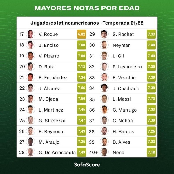 El listado tiene a varios jugadores muy reconocidos como Daniel Alves (39), Lionel Messi (35), Juan Guillermo Cuadrado (33), Neymar (30), Lisandro Martínez (24), Julián Álvarez (22), Enzo Fernández (21) o el prometedor jugador paraguayo Julio Enciso (18).
