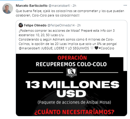 “¿Podemos comprar las acciones de Mosa? Preparé esta info con 3 escenarios: 10, 20, 50 lucas c/u. Considerando que según Adimark somos como 6 millones de colocolinos, la opción de las 20 lucas implica que solo un 8% se ponga.Marcelo Barticciotto juegue, lidere y lo seguimos”, escribió el hincha.