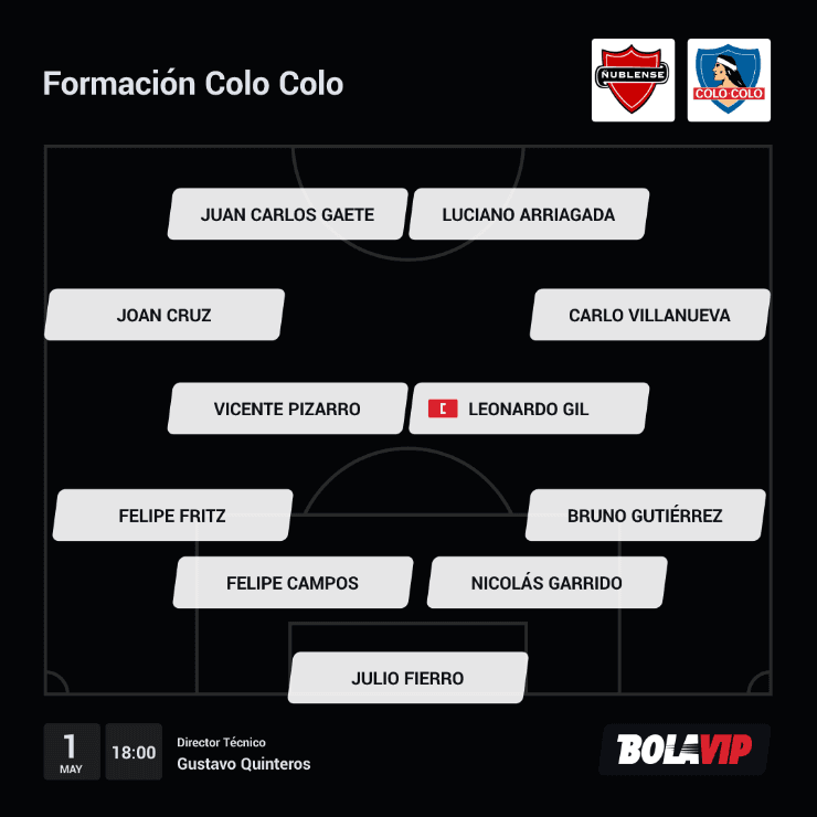 Colo Colo saldrá a la cancha de Chillán con Julio Fierro; Bruno Gutiérrez, Nicolás Garrido, Felipe Campos, Felipe Fritz; Leonardo Gil, Vicente Pizarro; Carlo Villanueva, Joan Cruz; Luciano Arriagada y Juan Carlos Gaete.