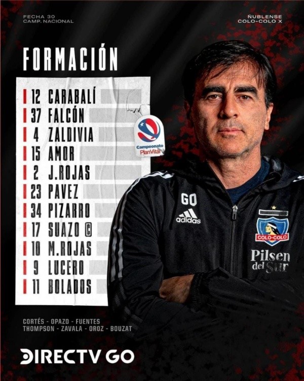 De esta manera, la formación de Colo Colo será con Omar Carabalí en el arco; Maximiliano Falcón, Matías Zaldivia y Emiliano Amor en defensa; Jeyson Rojas, Esteban Pavez, Vicente Pizarro, Gabriel Suazo en la zona de volantes: Marco Rojas, Juan Martín Lucero y Marcos Bolados en la delantera.