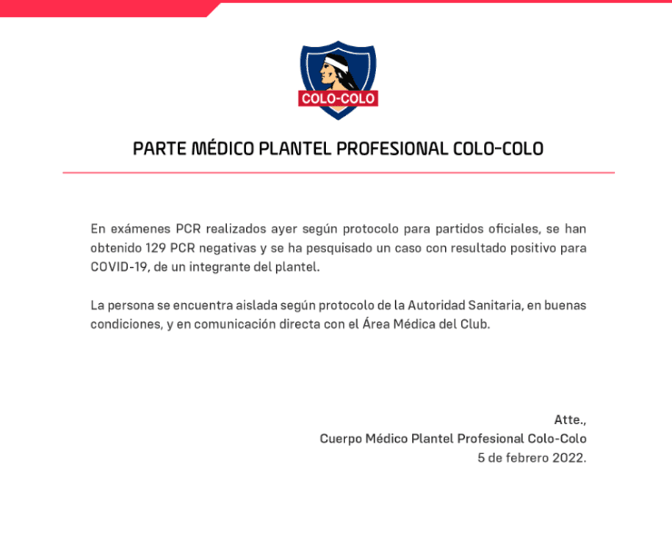 “En exámenes PCR realizados ayer según protocolo para partidos oficiales, se han obtenido 129 PCR negativas y se ha pesquisado un caso conresultado positivo para covid-19 de un integrante del plantel. La persona se encuentra aislada según protocolo de la autoridad sanitaria, en buenas condiciones y en comunicación directa con el área médica del club”, detalló el club albo en sus redes sociales.