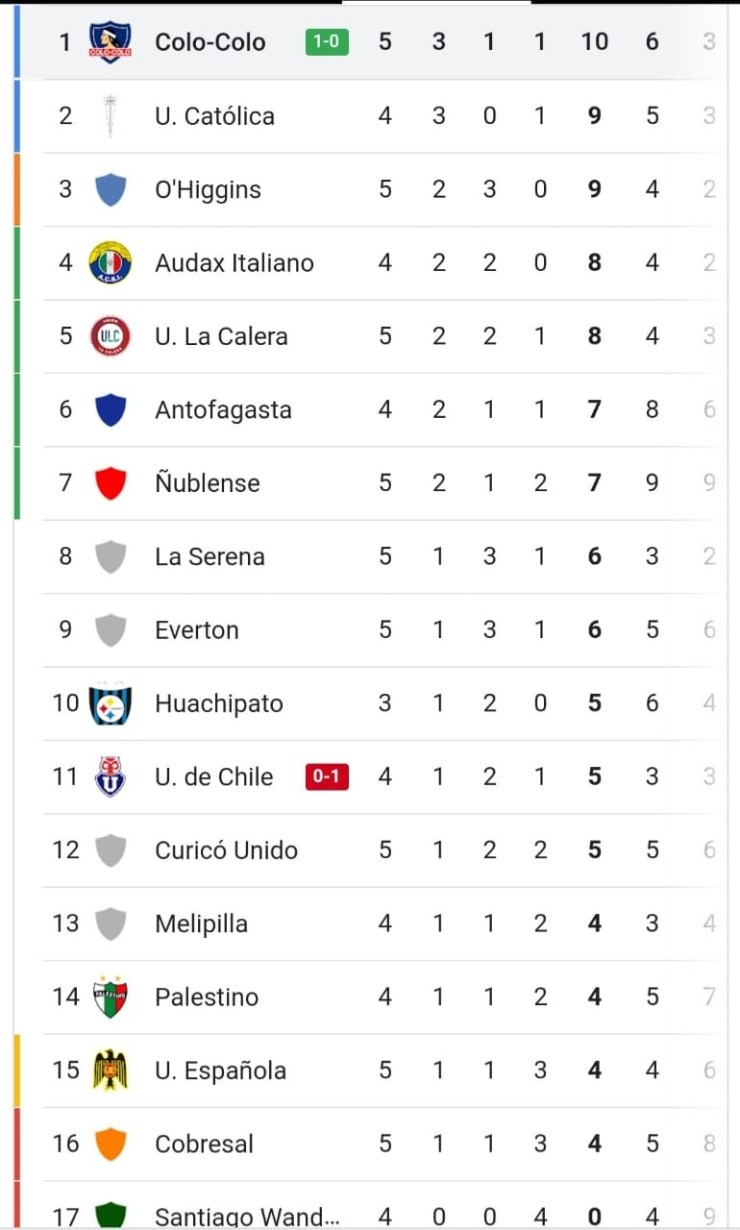 Más atrás está Audax Italiano y Unión La Calera con 8 puntos, aunque los itálicos tienen que completar su fecha mañana y podrían, eventualmente, superar al cacique.