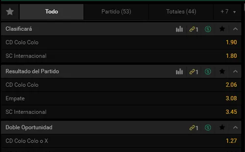 Para AlegreBet, el favorito para ganar este partido de los octavos de final de ida de la Copa Sudamericana 2022 es Colo Colo, que paga 2,06 veces lo que juegues, por sobre los 3,45 que paga Internacional de Porto Alegre, si piensas que es la visita quien gana en el Monumental. Ahora, el empate entre ambos paga 3,08 veces lo que apuestes.