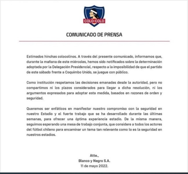 “Durante la mañana de este miércoles, hemos sido notificados sobre la determinación adoptada por la Delegación Presidencial, respecto a la imposibilidad de que el partido de este sábado frente a Coquimbo Unido se juegue con público”, reza el comunicado.
