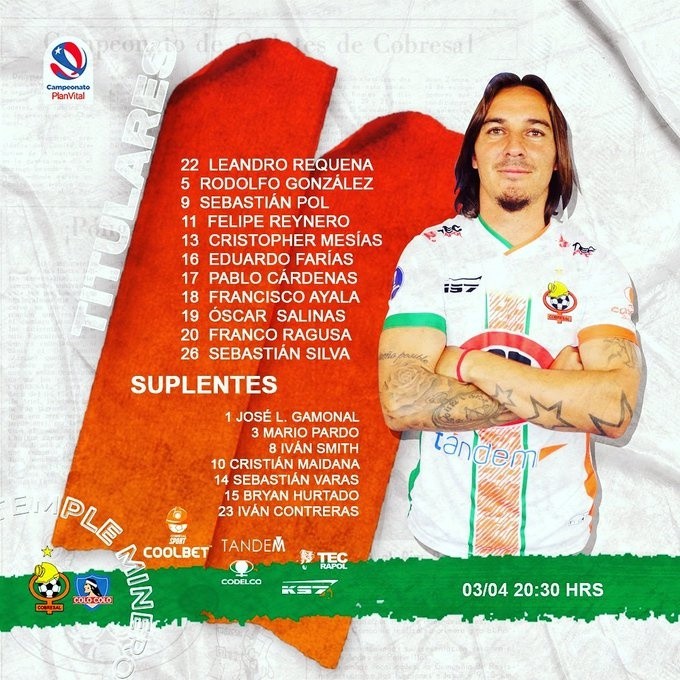 Por su parte, los localesalinearán con LeandroRequena, Pablo Cárdenas, Sebastián Silva, Rodolfo González, Francisco Ayala; Eduardo Farías, Cristopher Mesías, Franco Rasusa; Óscar Salinas, Felipe Reynero; Marcos Sebastián Pol.