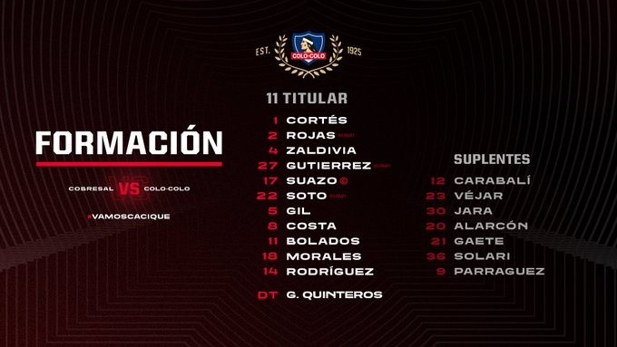 La formación del Cacique es conBrayan Cortés; Jeyson Rojas, Matías Zaldivia, Daniel Gutiérrez, Gabriel Suazo; Bryan Soto, Leonardo Gil, Gabriel Costa; Marcos Bolados, Iván Morales y Martín Rodríguez.