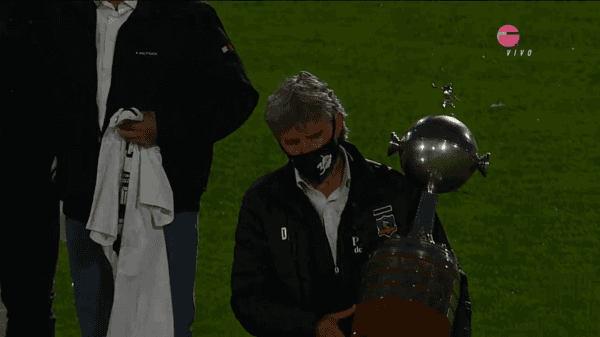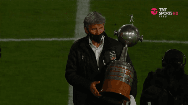 José Daniel Morón salió con el trofeo de la Copa Libertadores a la cancha David Arellano acompañado de un show de luces.
