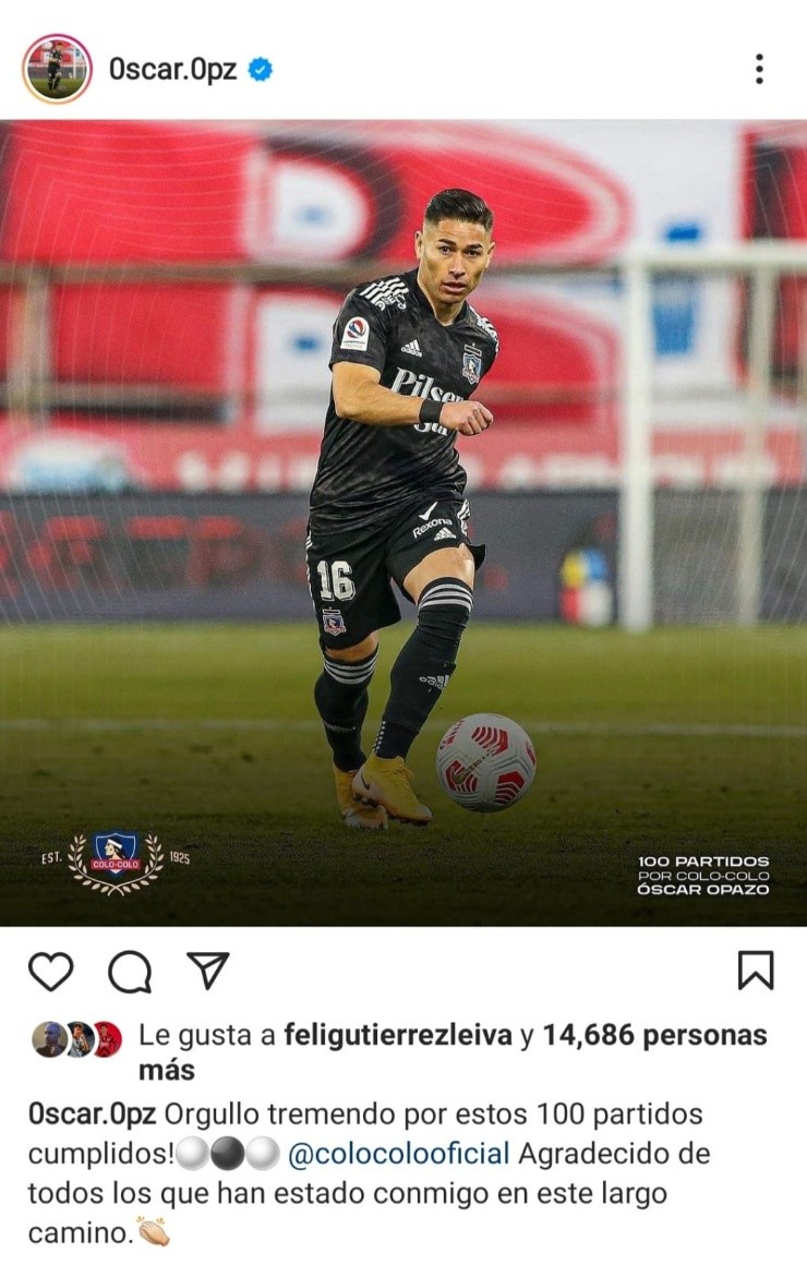Por último, Óscar Opazo tuvo palabras de agradecimiento por haber cumplido 100 partidos con la camiseta de Colo Colo, diciendo: “Orgullo tremendo por estos 100 partidos cumplidos. Agradecido de todos los que han estado conmigo en este largo camino”.